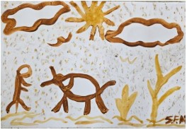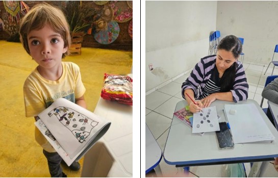 Durante a oficina, foram desenvolvidas atividades práticas e artísticas, como carimbos com digitais associados a animais cavernícolas, gravuras em relevo, desenhos com vela e anilina, produção de tintas com terra local e exploração de texturas com lápis cera sobre folhas secas. As práticas foram articuladas à valorização dos saberes locais, à educação ambiental e à contextualização com registros arqueológicos e pinturas rupestres.