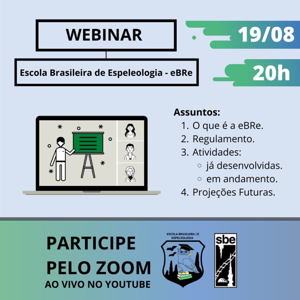 No dia 19 de agosto 2020, às 20 horas, foi realizado pela SBE a webinar com o objetivo de apresentar para a comunidade espeleológica, a Escola Brasileira de Espeleologia (eBRe), vinculada a Seção de Educação e Formação Espeleológica (SEFE/SBE). O webinar foi realizado pela plataforma Zoom e transmitido simultaneamente pelo canal do YouTube da SBE.